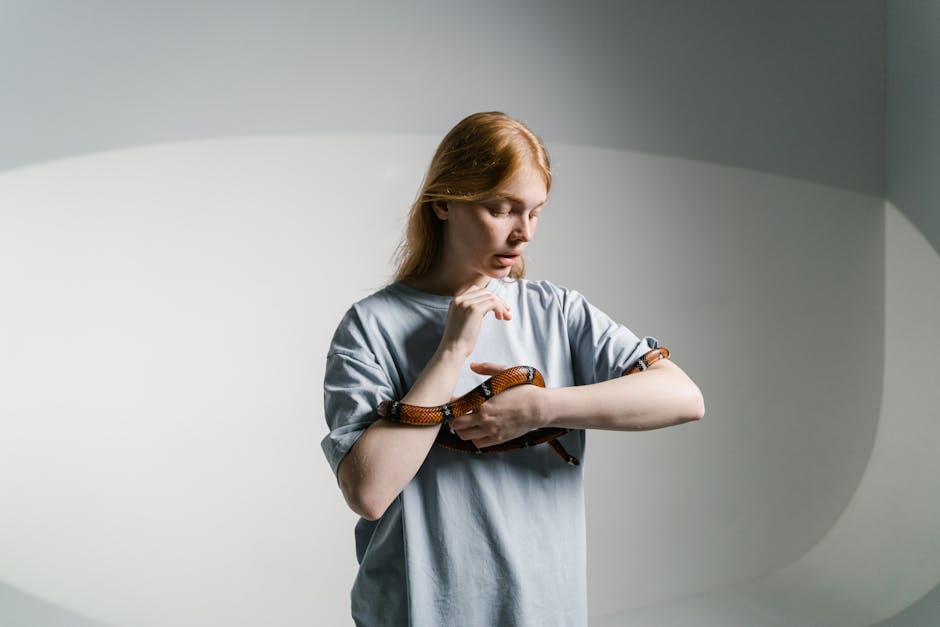 A person with long red hair wearing a light grey t-shirt gently holds a brown and orange snake, standing in a softly lit room with white and grey curved walls. | MyBestHub.com